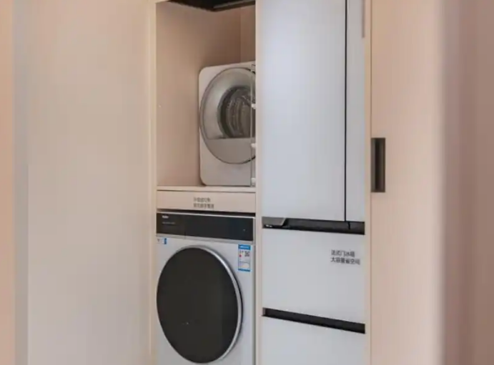 岳蒙設計的57㎡小戶型樣板房,精準錨定“幼升小”家庭的雙職工+長輩同住需求,通過“超級玄關”設計重構空間邏輯——將傳統客廳改造為集洗衣、冰箱、儲物柜于一體的復合功能區,解決小戶型“廚衛設備放不下、雜物無處儲存”的痛點。