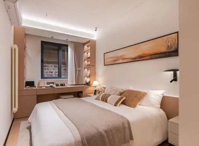 主臥空間具備兩大亮點,L型轉角衣櫥實現男女分區收納,大容量柜體滿足衣物分類存放;窗前迷你辦公區兼具梳妝功能,為業主提供私密的個人空間;兒童房則將床底設計為衣櫥,最大化利用垂直空間;該樣板間通過精細化的空間規劃與定制設計,為居住者營造出實用舒適的生活場景。