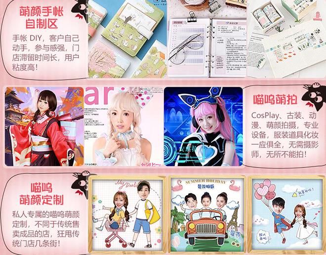 相比于很多與文具一起售賣的品牌店而言,喵嗚萌顏手帳自制區專門售賣手帳及周邊產品,節約了顧客的挑選時間,手帳制作空間的設置增加了互動體驗的愉悅感,形成了濃郁的品牌產品個性風格,有效提升了消費者的品牌認同感和忠誠度。