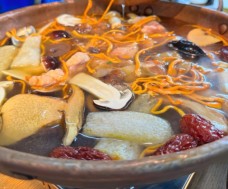 名善山珍野生菌湯鍋店主打一個空運來的新鮮,藏區野生松茸、羊肚菌、牛肝菌、鮮蟲草、見手青、竹蓀菌、鵝蛋菌、雞油菌、老人頭菌……菜單上的野生菌品種就多達十四種,很多都是你沒有見過的的新奇菌子。菌湯搭配空運來的各種菌子混煮后湯鮮味濃。慢火細燉之下,菌香四溢,一口下去,暖流直抵心田,仿佛能洗凈塵世的疲憊,菌湯鍋的魅力,還在于它的百搭性。