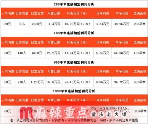以一家300平米的重慶火鍋加盟店為例,投資預(yù)算30-50萬(wàn)左右,雖然投資金額不少,但后期收益十分可觀。根據(jù)重慶火鍋排名前十強(qiáng)——重慶麻辣重點(diǎn)老火鍋近500家加盟店數(shù)據(jù)表明,火鍋加盟店平均回報(bào)周期在8-12個(gè)月。重慶火鍋加盟利潤(rùn)在餐飲行業(yè)中極高,這也是不少人選擇加盟開店的原因之一。