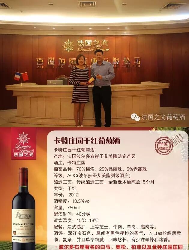 法國之光董事長與袁總合影留念并贈送2012年卡特莊園簽字紀念版作為禮品,共賀法國之光董事長榮獲法國魯拉德騎士勛章。