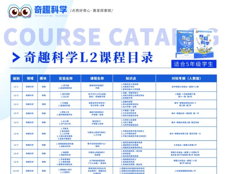 奇趣科學的課程體系,由中國科學院、北航科學教育專家領銜研發,遵循“興趣激發—思維搭建—能力銜接”三步走策略,機構課程覆蓋小學三至六年級。