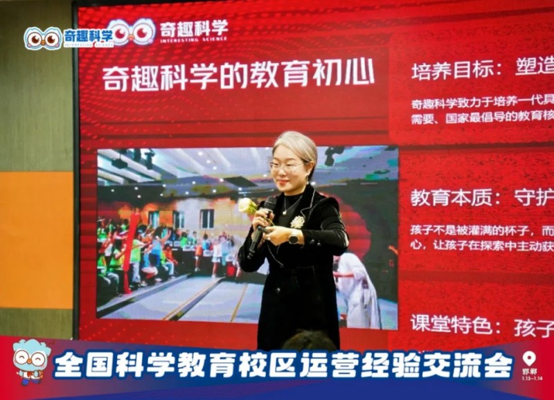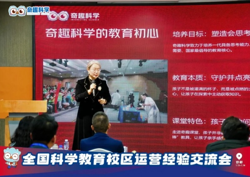 科學(xué)秀落幕,干貨分享環(huán)節(jié)正式開啟。奇趣科學(xué)創(chuàng)始人張芳老師率先登臺(tái),帶來“點(diǎn)燃探索力,共筑科學(xué)教育未來”的主題分享。她結(jié)合行業(yè)趨勢,深度解讀“雙減”背景下科學(xué)教育的黃金發(fā)展機(jī)遇,以邯鄲校區(qū)成為河北省標(biāo)桿、唐山趙校長一年開設(shè)二十余家校區(qū)的亮眼成果,印證了科學(xué)教育的強(qiáng)勁勢能。
