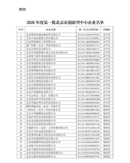 2026年1月12日,北京市經濟和信息化局正式發布公告,公布了2026年度第一批北京市創新型中小企業名單。