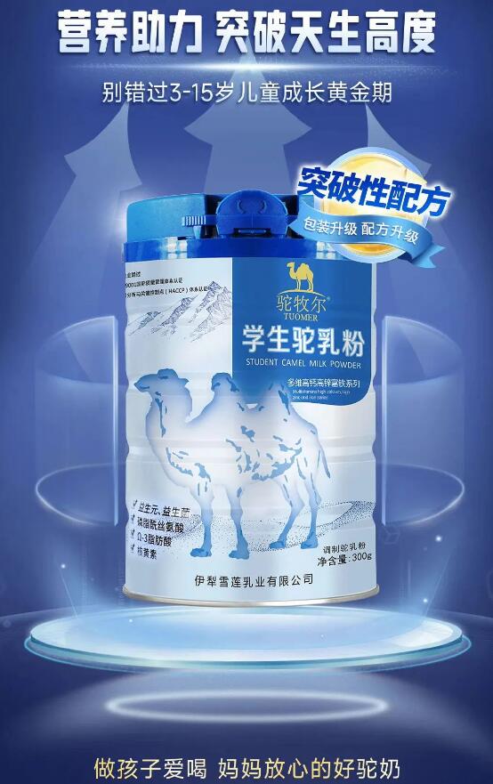 駝牧爾,源于天山最高峰托木爾峰諧音,是伊犁雪蓮乳業旗下自營駝奶品牌。駝牧爾駝奶品牌產品是采用新疆伊犁雙峰駱駝所生產的鮮奶,結合科學先進的工藝精制而成。駝牧爾駝奶系列產品主要包括:有機純駝乳粉、純駝乳粉、初乳配方駝乳粉、益生菌配方駝乳粉、乳酸菌配方駝乳粉、學生配方駝乳粉、富硒高鈣駝乳粉、駝奶粗糧餅干、駝奶貝/片等,系列產品被國家產品質量安全與法信息中心評定為“質量安全誠信品牌”。