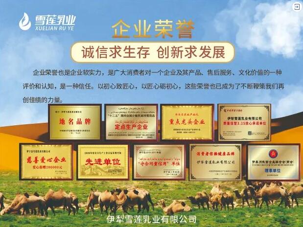 2007年榮獲"新疆農業名牌產品"稱號;2009年獲得民族特需商品定點生產企業榮譽;2010年被評為伊犁州農業產業化重點龍頭企業;2011年被國家產品質量安全與法信息中心評為"質量安全誠信品牌";2012年被評為伊犁州陜西企業聯合會(商會)理事單位;2014年被評為伊犁州愛心慈善單位;被評為新疆農業名牌產品;2016年率先開發出益生菌配方駝乳粉與初乳配方駝乳粉;2018年被評為新疆維吾爾自治區農業產業化重點龍頭企業;2019年獲得中國特色乳十大品牌;2020年被評為全國消費者放心滿意品牌;2021年被中國地名學會授予伊犁駝奶地名品牌;2021年第六次被評為新疆自治區重點龍頭企業;2021年榮獲中國有機產品認證;2021年榮獲"質量檢驗-國家標準合格產品";2022年榮獲中國質量萬里行質量信譽3.15放心承諾單位"......
