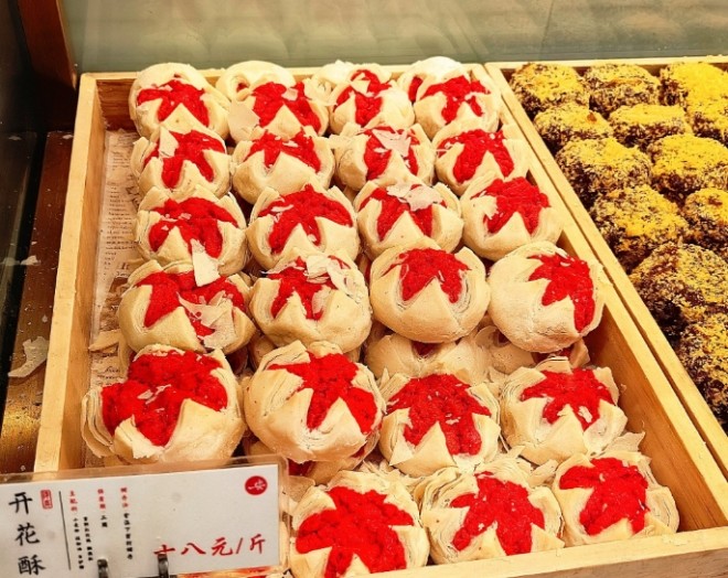 鮮花餅:當(dāng)季玫瑰去蒂只留花瓣,蜜漬三日后與蜂蜜、炒糯米粉揉成餡。咬開時(shí),花瓣的脈絡(luò)清晰可見,甜香中透著清冽的綠意。