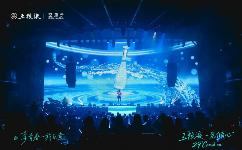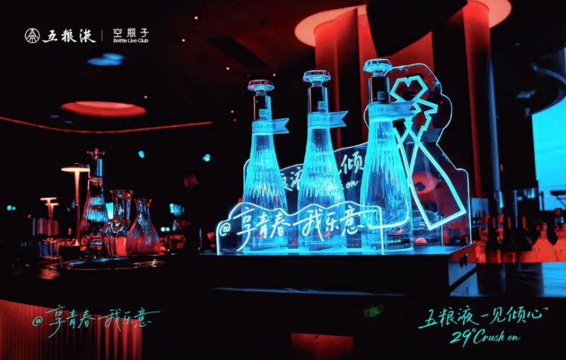 當(dāng)夜幕降臨,位于成都錦江區(qū)的空瓶子酒吧門口早已是人頭攢動。走進(jìn)大門,一整面五糧液一見傾心產(chǎn)品展示墻映入眼簾,天青色水晶玻璃瓶在燈光下流光閃爍。酒吧內(nèi)場吧臺,“五糧液一見傾心”的燈牌和熒光棒閃爍其間,卡座上“享青春我樂意”的品牌定制臺卡,恰是在場年輕人生活態(tài)度的真實(shí)寫照。