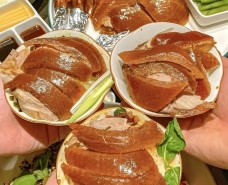 山東御京荷餐飲管理有限公司旗下品牌御京荷北京烤鴨經典的燜爐烤制技法,填鴨在進掛爐前用多種天然秘制材料腌制,再用上等果木燜爐360°無死角碳烤,可以看見鴨油慢慢的被烤出來。棗紅色皮膚和沁人心脾的果木香味,是御京荷北京烤鴨北京烤鴨的專屬標志。入口外酥里嫩,肥而不膩,口感純香,一口淪陷!【更多詳情】